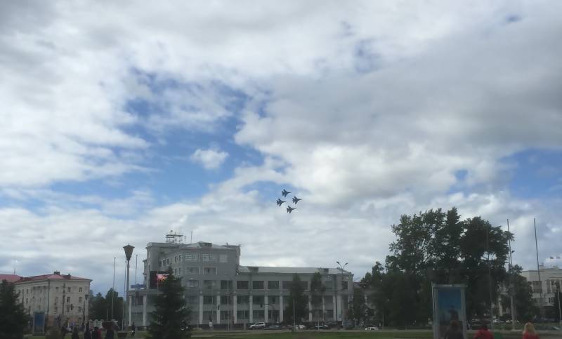Сегодня над центром Архангельска провели тренировку летчики знаменитой пилотажной группы «Русские Витязи» на самолетах Су-27 и Су-27УБ.