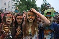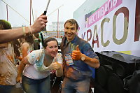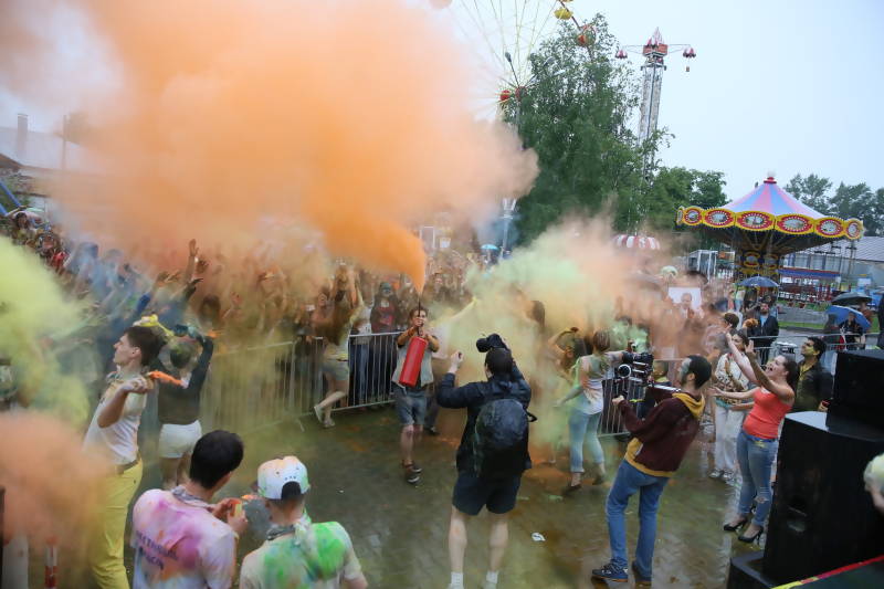 В парке аттракционов «Потешный двор» тысячи горожан собрались, чтобы раскрасить друг друга во все цвета. Полтонны специальных красок растительного происхождения накануне привезли в Архангельск.