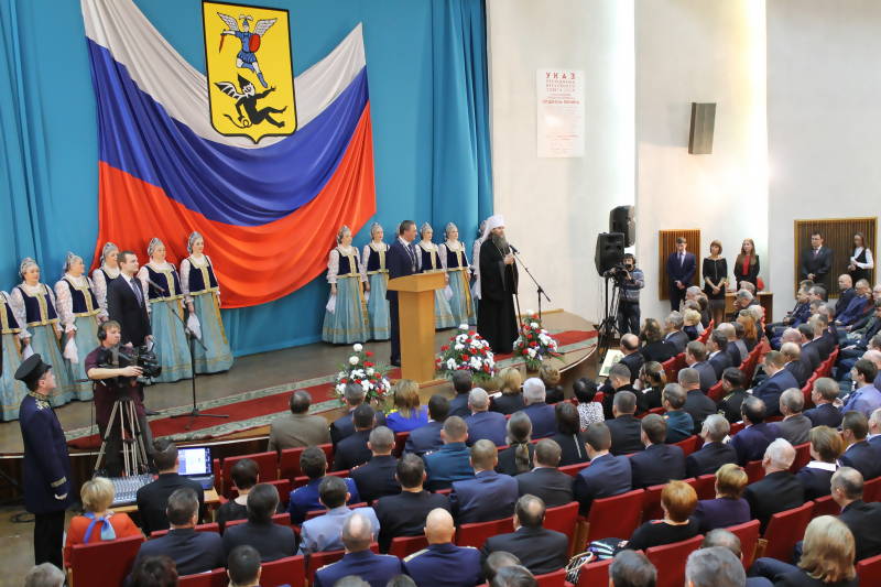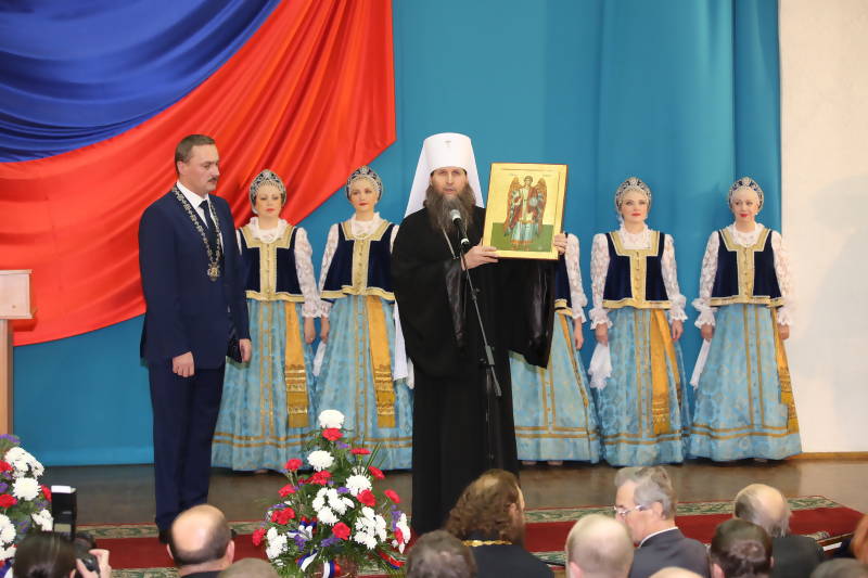 Митрополит Архангельский и Холмогорский Даниил благословил главу города иконой небесного покровителя столицы Поморья Архангела Михаила со словами: