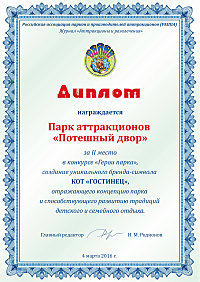 Парк аттракционов «Потешный двор» занял второе место на конкурсе «Герои парка», который провел журнал «Аттракционы и развлечения», и награжден дипломом за создание уникального бренда.