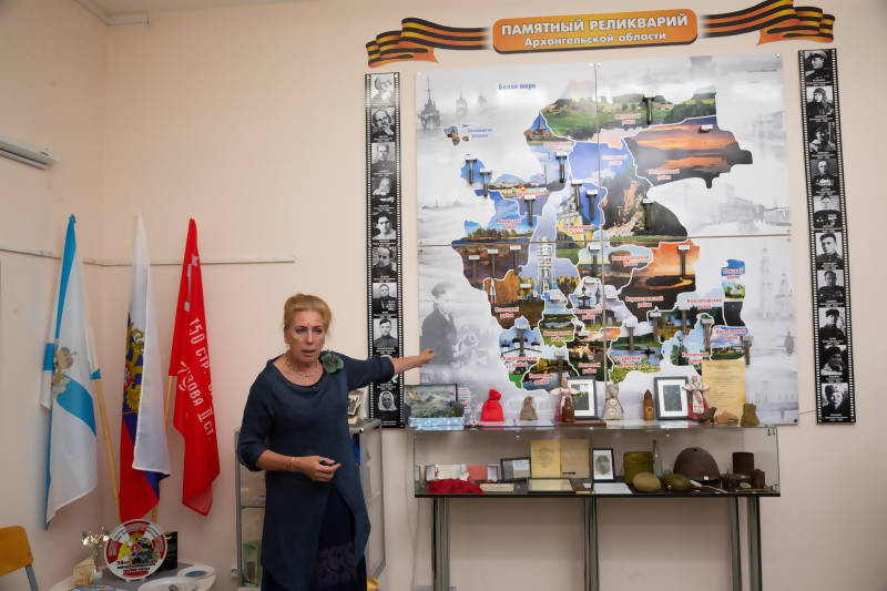 Главное пространство нового помещения – комната трудовой, боевой и воинской славы Архангельска. Главная экспозиция здесь – памятный реликварий. На стене – стенд с изображением нашей области и фотографиями двадцати знаменитых северян – от Николая Кузнецова и Розы Шаниной до Степана Писахова и Федора Абрамова. Рядом - капсулы с землей, привезенной с их родины.