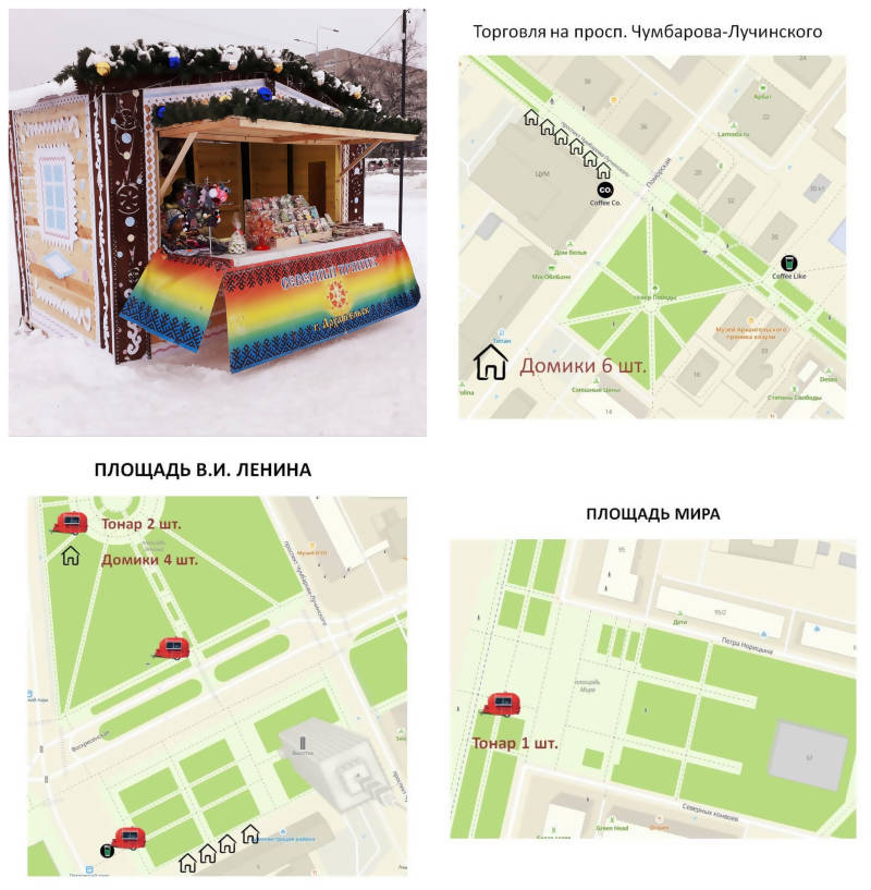 Новогодняя ярмарочная торговля с 25 декабря будет организована на пр. Чумбарова-Лучинского у центрального универмага, на площади Ленина у главной ёлки и на площади Мира – вблизи горки для катаний.Основная тема новогоднего оформления – «Пряничная зима» - найдет свое отражение и в дизайне ярмарочных домиков.
