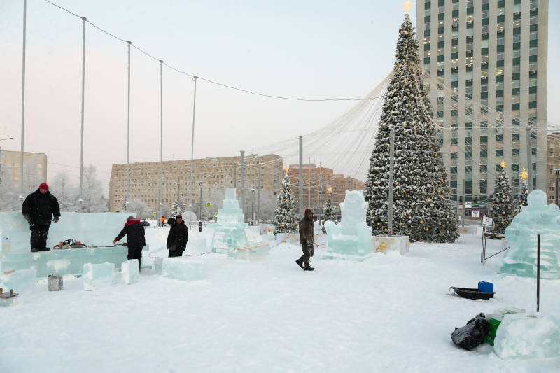 Самый большой ледовый городок строится на площади Ленина у центральной елки. Сегодня глава Архангельска Дмитрий Морев встретился с мастерами и спонсором украшения.Руководитель творческой мастерской «Изольда» Юлия Рюмина рассказала, что резкое наступление морозов позволяет в этом году сделать фигуры особенно красивыми: лед прозрачный, без вкраплений снега. Его мастера берут в озере Волохница.