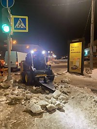 Расчистка тротуаров и остановок, погрузка снега, содержание пешеходных переходов, обработка противогололёдными материалами продолжается.