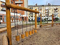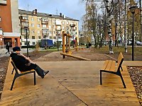 Деревянный тротуар по внешней стороне сквера заменила тротуарная плитка, а вот внутри наоборот - сеть "парящих" деревянных дорожек. Игровые элементы также выполнены из экологичной древесины. Поскольку сквер транзитный, то большую детскую площадку не создавали. Но теперь по пути следования есть возможность отдохнуть и взрослым, и детям.