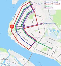 - маршрут 75Б - пр. Троицкий, ул. Гагарина, ул. Тимме (остановки "Швейная фабрика", "Тимме - Воскресенская"), ул. Воскресенская (остановки "Тимме - Воскресенская", "АГКЦ", "Площадь Дружбы народов", "Проспект Обводный канал"), пр. Обводный канал и далее по маршруту.