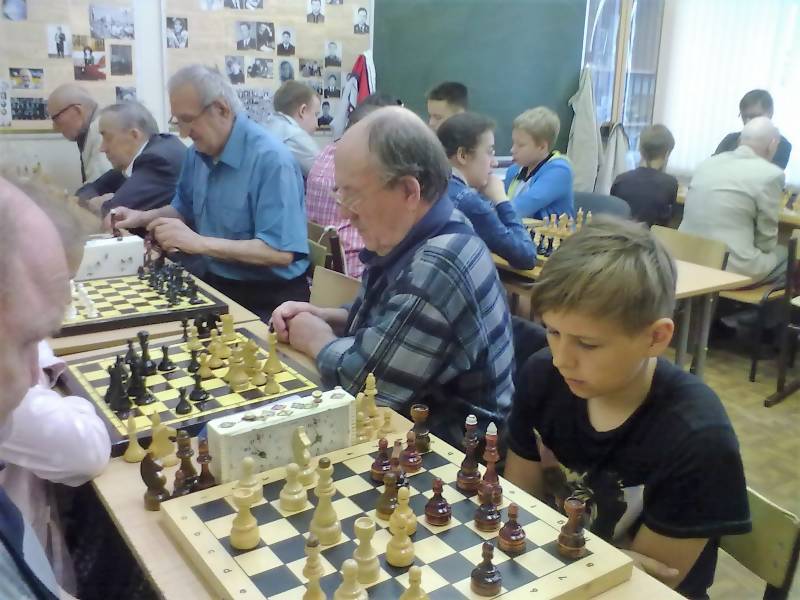 В "День города" ветераны - члены клуба "Белая ладья и шашечка" играли с горожанами всех возрастов в шашки и шахматы в холле гимназии №6. Приходили мамы и папы с детьми, чтобы сразиться с ветеранами на шахматных и шашечных досках.