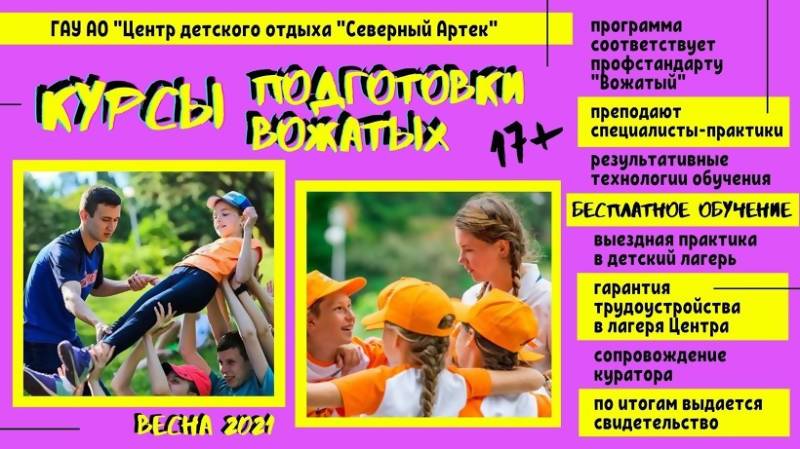 Центр детского отдыха «Северный Артек» приглашает желающих в возрасте от 17 лет на курсы подготовки вожатых. Обучение будет проходить в Архангельске с 9 марта по 29 мая два раза в неделю. Количество мест ограничено.