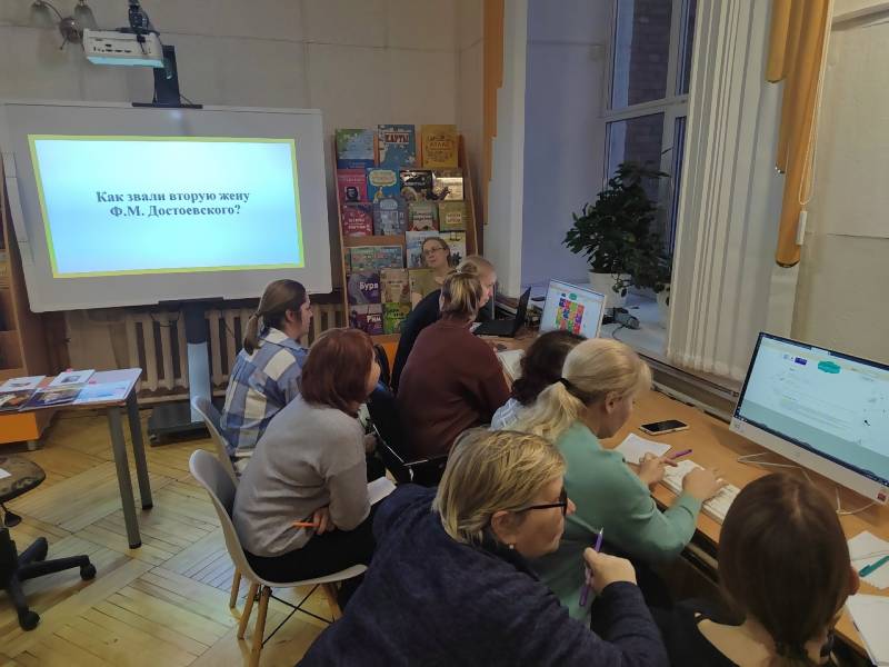 Библиотекари методического отдела АОДБ им.А.П.Гайдара Федорова Ирина Александровна и Макурина Анна Николаевна провели для работников школьных библиотек практикум в форме игры. Библиотекари разделились на команды и используя онлайн-гид по полезным и безопасным веб-ресурсам Интернета для детей и подростков "Вебландия" выполняли задания по поиску ответов на вопросы ведущих.