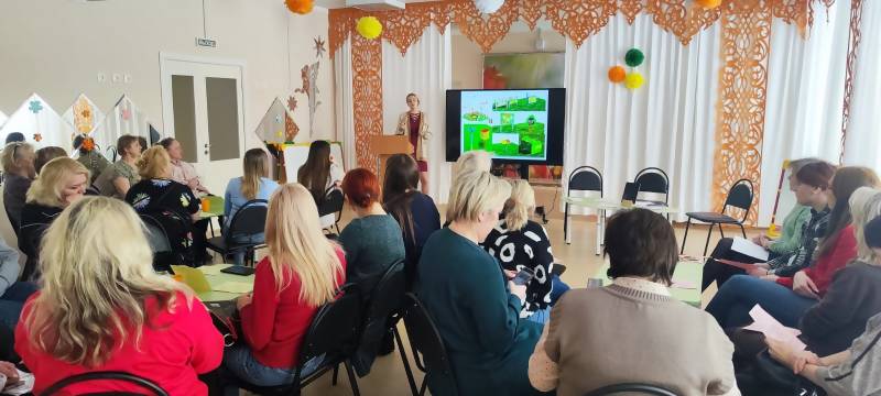 Педагоги детского сада "Полянка" Чушкова Н.М. и Насонова А.В. рассказали о том, как используют территорию Green-парка в работе с дошкольниками. Старший воспитатель детского сада "Дубок" Попова Н.Р. поделилась опытом организации детской научно-исследовательской лаборатории под открытым небом. Одоева Е.Ю., воспитатель детского сада "Веснушка", представила путешествия с дошкольниками по экотропе. Буторина М.В., воспитатель детского сада "Сиверко", продемонстрировала коллегам работу по экологическому воспитанию дошкольников в ходе прогулок по экопарку "Под полярной звездой". Все выступления показали огромную работу педагогов по формированию экологической культуры детей.