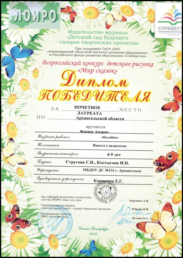 Творческие работы "Сказка о рыбаке и рыбке" Кузнецова Никиты и "Колобок" Фокина Андрея награждены дипломами победителей.
