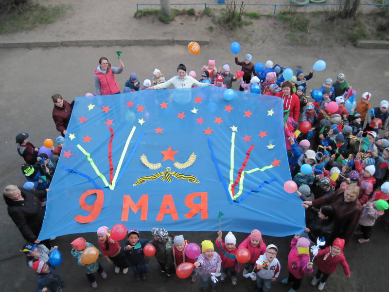 Ребята выстроили живую композицию "9 МАЯ", вместе с воспитателями растянули самодельный транспарант к празднику.