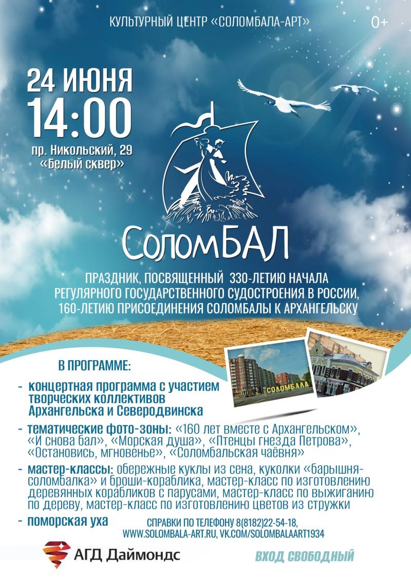 В Соломбальском территориальном округе 24 июня в 14:00 состоится уличный праздник "СоломБАЛ". Мероприятие пройдёт в Белом сквере по адресу: проспект Никольский, 29.