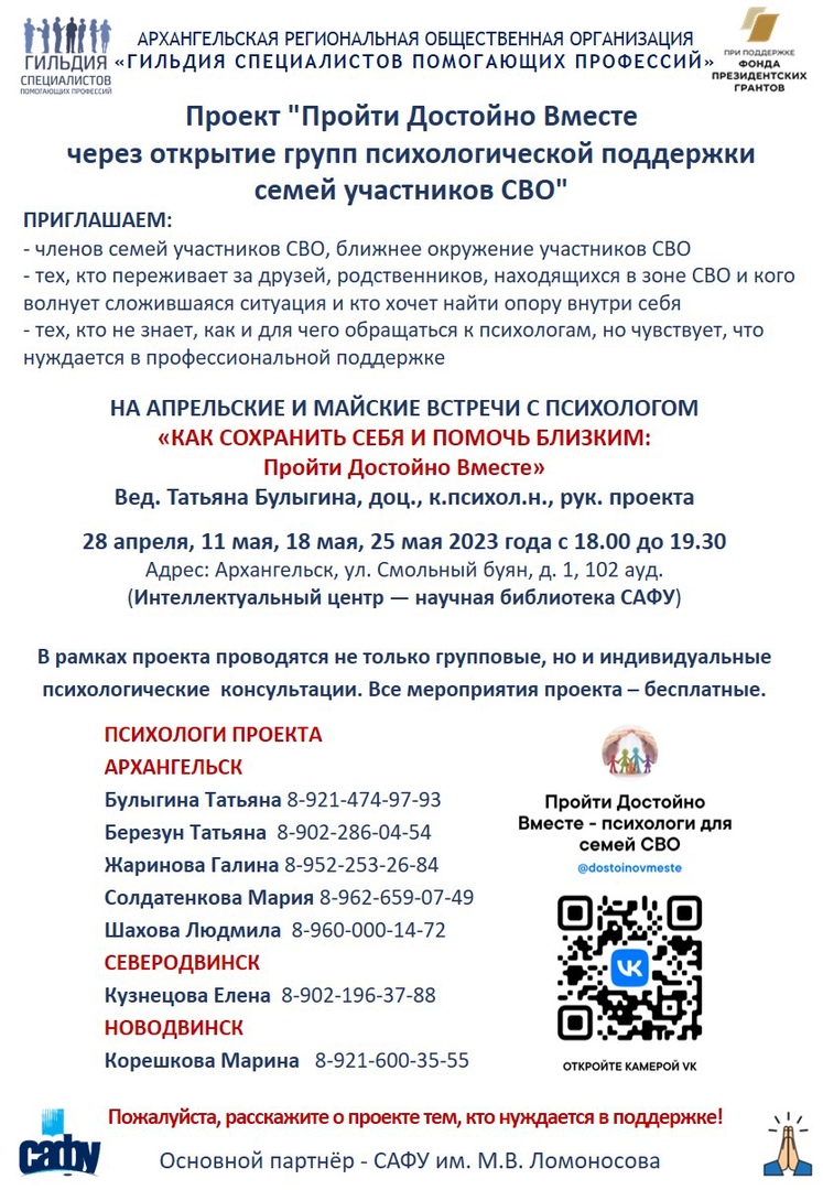Государственное бюджетное учреждение Архангельской области для детей, нуждающихся в психолого-педагогической и медико-социальной помощи, "Центр психолого-медико-социального сопровождения "Надежда" информирует о реализации проекта "Пройти Достойно Вместе через открытие групп психологической поддержи семей участников СВО", в рамках которого запланированы встречи с психологами.