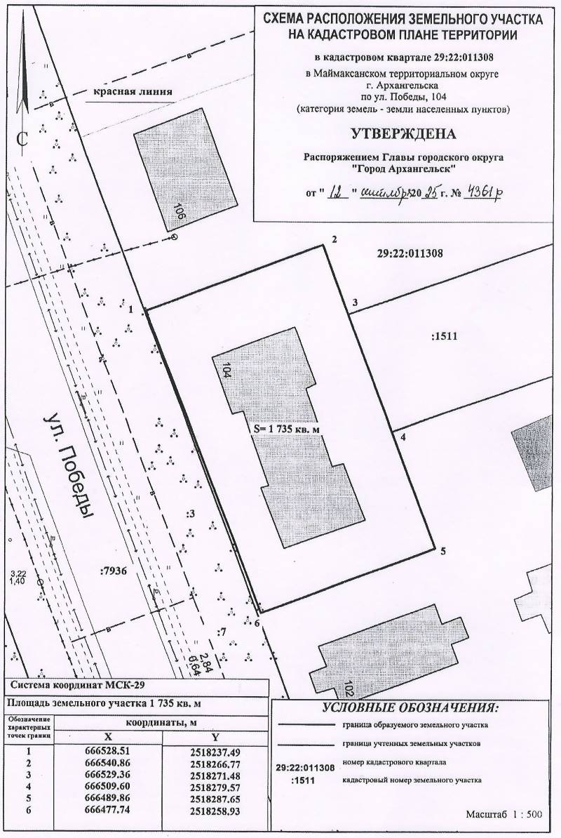 2. Адрес месторасположения земельного участка: г. Архангельск, ул. Победы, д. 104. Данный земельный участок расположен в кадастровом квартале 29:22:011308. Утвержденная схема расположения земельного участка: