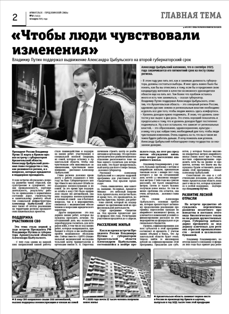 «Чтобы люди чувствовали изменения. Владимир Путин поддержал выдвижение Александра Цыбульского на второй губернаторский срок»;