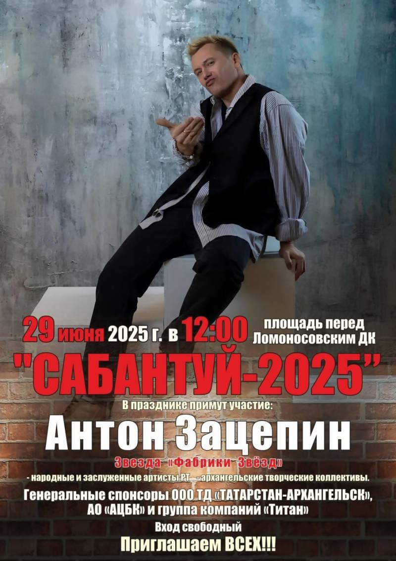 На Сабантуе в Архангельске вновь выступит звезда. В этом году гостей поразит Антон Зацепин, выпускник четвёртой «Фабрики звёзд». Помимо него, на сцене выступят народные и заслуженные артисты Республики Татарстан, а также лучшие творческие коллективы Архангельска.