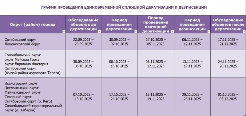 Информируем Вас, что в соответствии с постановлением Администрации городского округа "Город Архангельск" № 1455 от 10 сентября 2025 года "О проведении единовременной дератизации и дезинсекции в городском округе "Город Архангельск" организациям, осуществляющим деятельность на территории городского округа "Город Архангельск", рекомендовано организовать и провести на территории города Архангельска единовременную сплошную дератизацию и дезинсекцию в период с 22.09.2025 по 05.12.2025 согласно утвержденному графику.