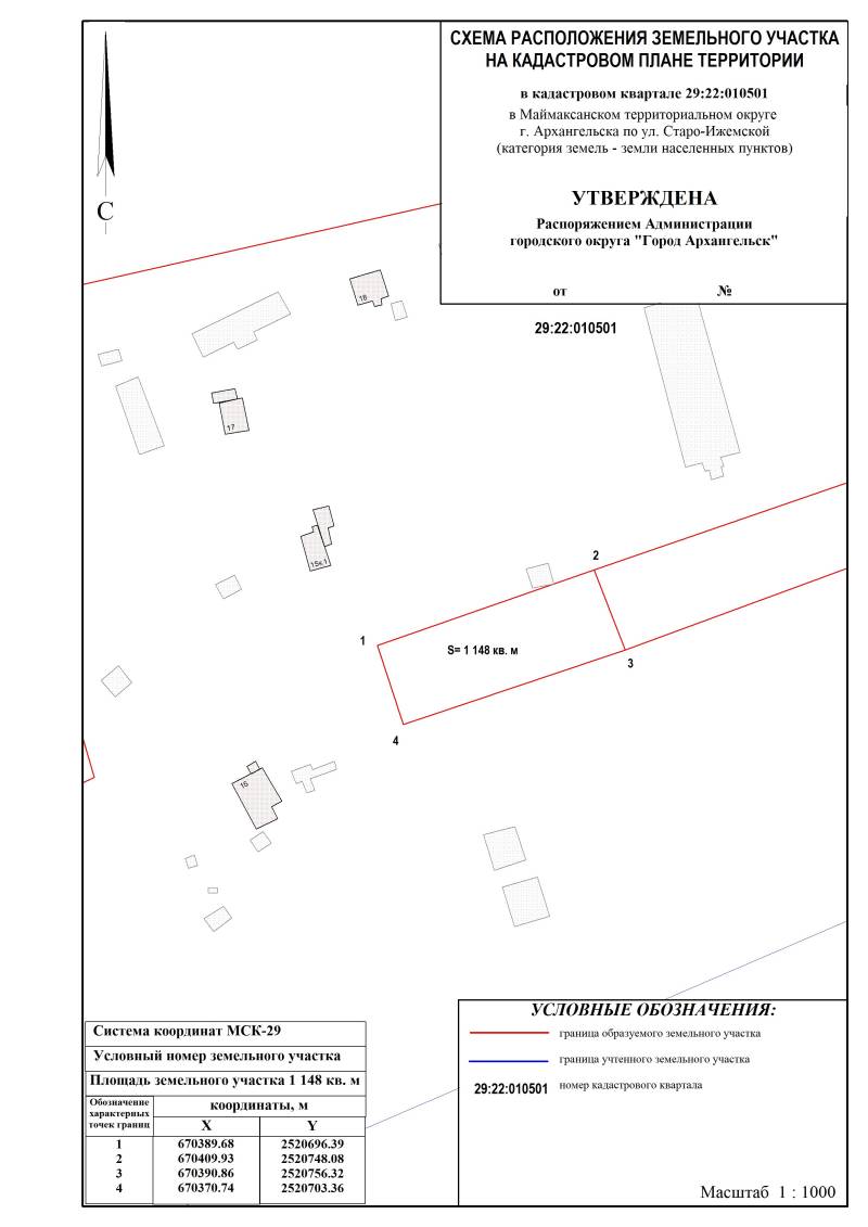 Извещение о предоставлении земельного участка для индивидуального жилищного строительства, расположенного в Маймаксанском территориальном округе г. Архангельска по ул. Старо-Ижемской площадью 1 148 кв. м